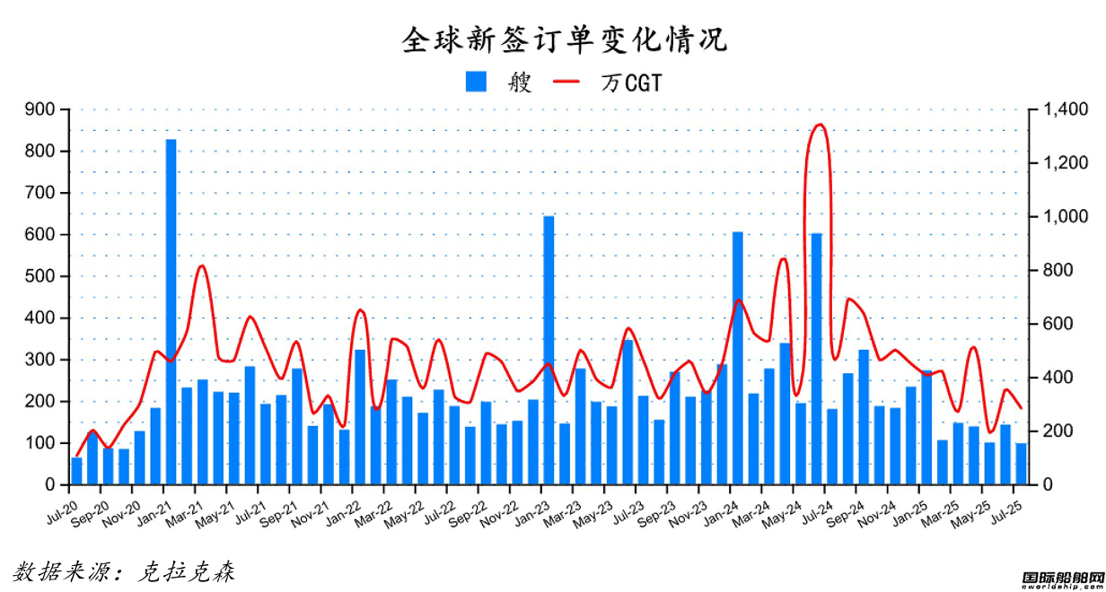 根据克拉克森最新数据统计(截至2025年8月10日),2025年7月份全球新签订单97艘,共计2,861,435CGT。与2025年6月份全球新签订单142艘,共计3,573,211CGT相比较,数量环比减少45艘,修正总吨环比下降19.92%。与2024年7月份全球新签订单180艘,共计4,938,371CGT相比较,数量同比减少83艘,修正总吨同比下降42.06%。