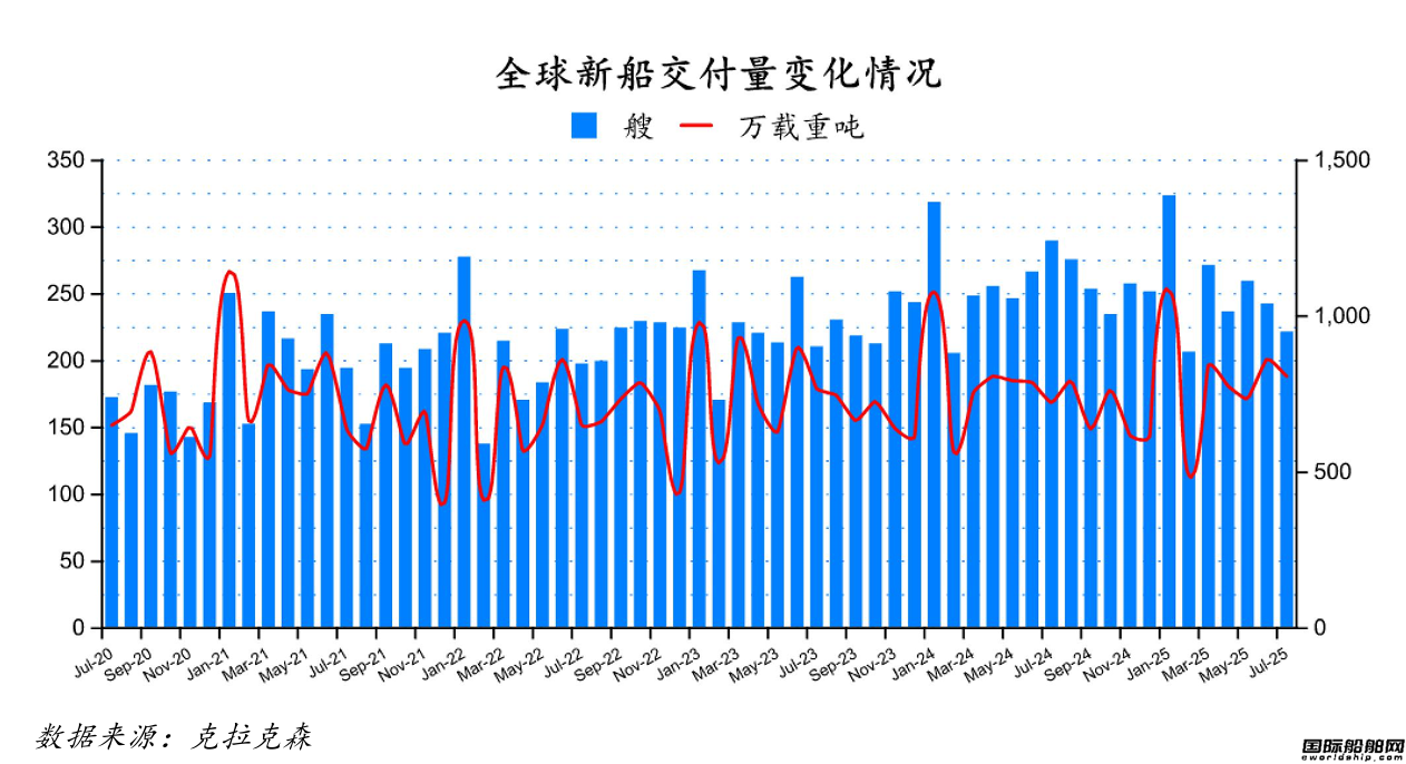 2025年7月份全球船厂共交付新船221艘,共计8,074,942载重吨。与2025年6月份全球新船交付订单242艘,共计8,641,443载重吨相比较,数量环比下降8.68%,载重吨环比下降6.56%。与2024年7月份全球船厂共交付新船289艘,共计7,224,813载重吨相比较,数量同比下跌23.53%,载重吨同比上升11.77%。