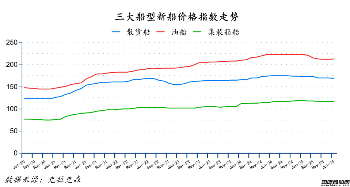 7月份散货船新船价格指数环比下跌1点,为169点;油船新船价格指数环比上升1点,为213点;集装箱船新船价格指数环比持平,为117点。
