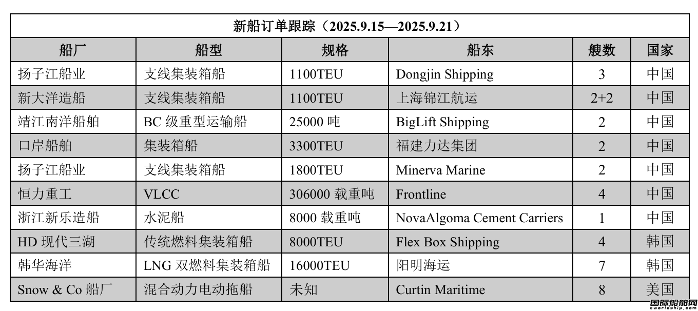 新船订单跟踪(2025.9.15—2025.9.21)
