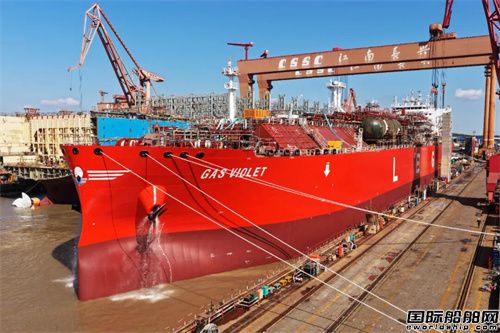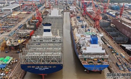 本次出坞的两艘整船分别是为法国达飞建造的15000TEU甲醇双燃料动力大型集装箱船“CMA CGM CARMEN”号(H2793)和为天津西南海运旗下公司Sinogas Maritime建造的99000立方米超大型乙烷运输船(VLEC)“GAS VIOLET”号(H2712)。