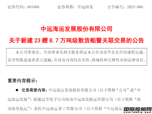 10月31日,中远海发宣布,拟通过全资子公司海南中远海发航运有限公司委托大连中远海运重工有限公司建造23艘8.7万吨级散货船,交易总金额人民币73.37亿元,单船船价为人民币3.19亿元(不含税),预计首船将于2027年5月20日或更早的时间交付(不含税),其他陆续于2028年底前交付。