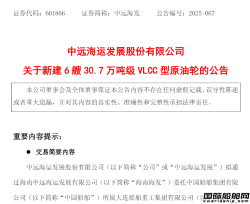 同日,中远海发还宣布,拟通过海南中远海运发展有限公司委托中国船舶集团有限公司所属大连船舶重工集团有限公司建造6艘30.7万吨级VLCC,交易总金额人民币50.858亿元(不含税),单船船价为人民币8.478亿元(不含税)。其中首艘船计划于2027年4月份开始交付,后期船舶将陆续于2028年11月底前完成交付。