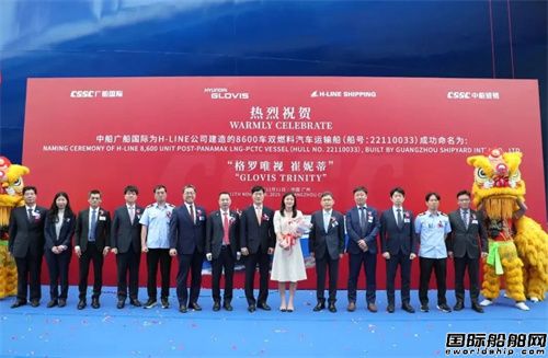 命名嘉宾车美兰女士,H-LINE航运公司总裁徐命得先生,GLOVIS(韩国现代物流有限公司)副总裁权治五先生、金一焕先生,GMS副总裁权奇敦先生,韩国船级社高级副总裁金成柱先生,中国船舶工业贸易有限公司船海业务三部副总经理赖丽华女士,DNV经理池韶光先生,广船国际有限公司董事、总经理周旭辉先生等领导和嘉宾出席命名仪式。命名仪式由广船国际副总经理康友平主持。
