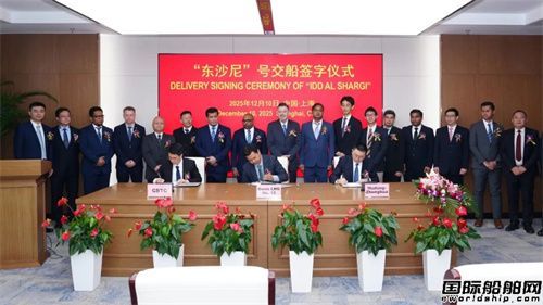 马来西亚国际航运公司改装及新造船部部门长Yusmi Ismail代表船东方,中国船舶工业贸易有限公司船海业务三部业务经理曹明生代表贸易方,沪东中华总经理助理、营销部部长王佳颖代表建造方,共同签署交船文本。