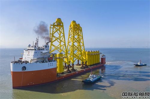 本次交付的基础结构包括3套导管架和11套单桩过渡段,导管架高95.19米,总重量约6400吨;单桩过渡段高31.73米,总重量约7450吨,最大直径8.31米,筒壁厚度达125毫米。