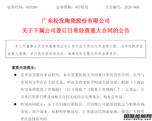 1月16日晚间,广东松发陶瓷股份有限公司发布公告称,下属公司恒力造船(大连)有限公司4艘VLCC和1艘LR2型成品油/原油运输船建造合同于1月15日签约生效。