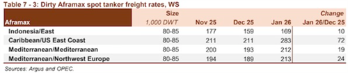 清洁即期运费表现强劲,以中东地区的出口为主导。苏伊士以东地区的运费平均环比上涨9%,而苏伊士以西地区的运费环比上涨2%。与前一年相比,苏伊士以东地区运费上涨40%,而苏伊士以西地区运费上涨18%。中东至东行航线的运费上涨17%,平均为WS204。与2025年1月相比,运费高出40%。