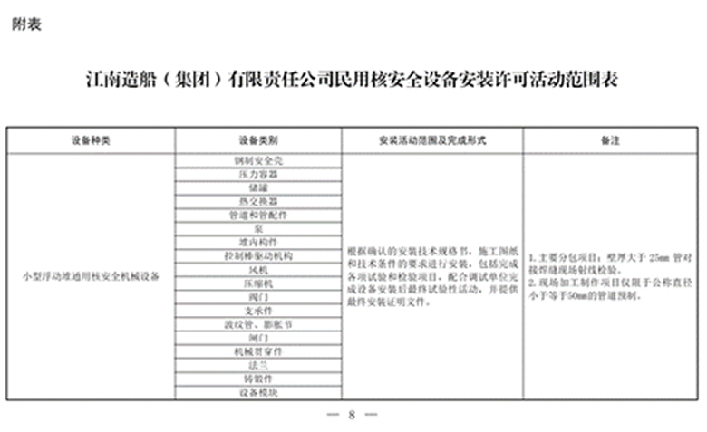 与此同时,江南造船可从事安装活动的民用核安全设备种类包括小型浮动堆通用核安全机械设备、小型浮动堆通用核安全电气设备,根据确认的安装技术规格书,施工图纸和技术条件的要求进行安装,包括完成各项试验和检验项目,配合调试单位完成设备安装后最终试验性活动,并提供最终安装证明文件。