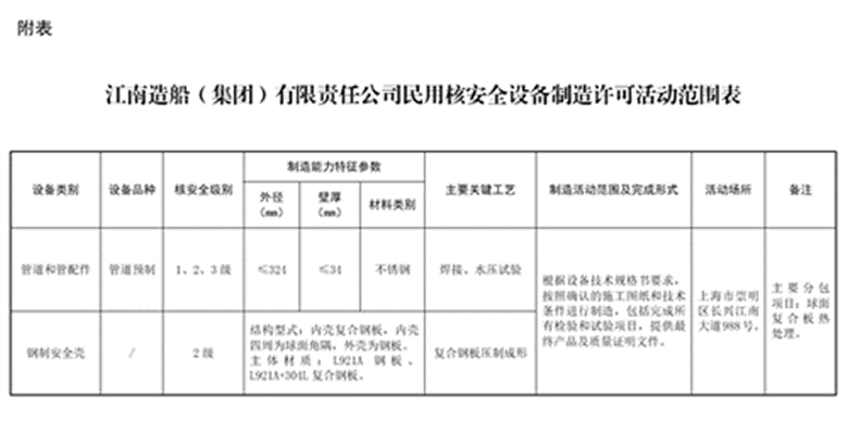 许可证显示,江南造船可从事制造活动的民用核安全设备种类包括管道和管配件、钢制安全壳,根据设备技术规格书要求,按照确认的施工图纸和技术条件进行制造,包括完成所有检验和试验项目,提供最终产品及质量证明文件。