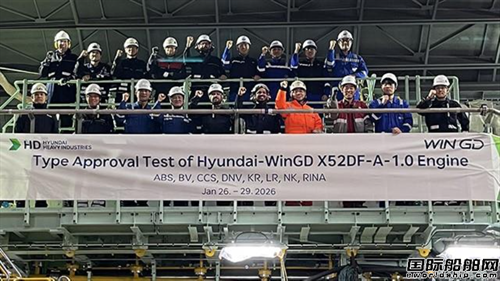 近日,WinGD研发的氨燃料二冲程船用发动机顺利完成型式认可测试(TAT)及工厂验收测试(FAT),两项测试程序均于2026年1月圆满收官。X52DF-A-1.0发动机的测试在韩国HD Hyundai Heavy Industries Engine & Machinery(HHI-EMD)工厂开展,在英国劳氏船级社及各大主要船级社代表,EXMAR公司相关领导共同见证。