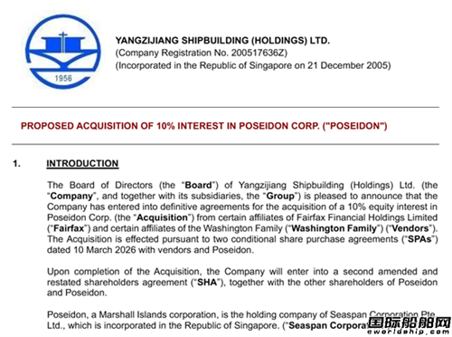3月10日,扬子江船业发布公告称,与加拿大保险公司Fairfax Financial Holdings Limited的若干关联方以及Washington家族的若干关联方(合称“卖方”)签署最终协议,以收购Poseidon公司10%的股权。Poseidon是一家注册于马绍尔群岛的公司,其为全球最大独立集装箱船船东Seaspan的控股公司。