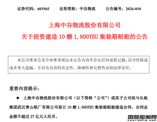 4月2日晚间,中谷物流发布公告称,为持续优化公司船队结构,稳步扩展船队规模,积极打造经济性高、竞争力强的集装箱运输船队,不断提升企业竞争优势,公司或其子公司拟与长航集团武汉青山船厂有限公司签订10艘1800TEU集装箱船建造合同,合同总金额不超过27亿元人民币。新船预计2028-2029年交付。